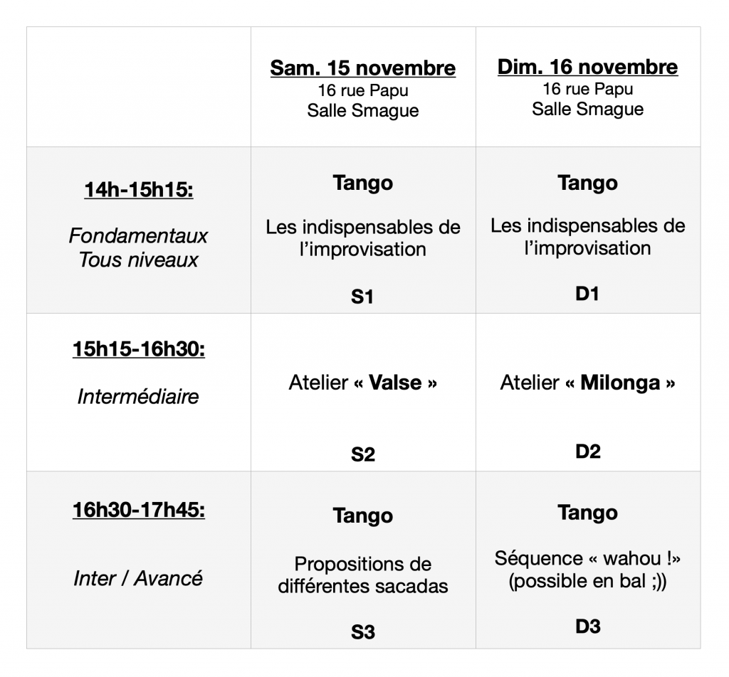(débutant à avancé), et deux milongas (bal de tango), ouvert à tout.es 🙂